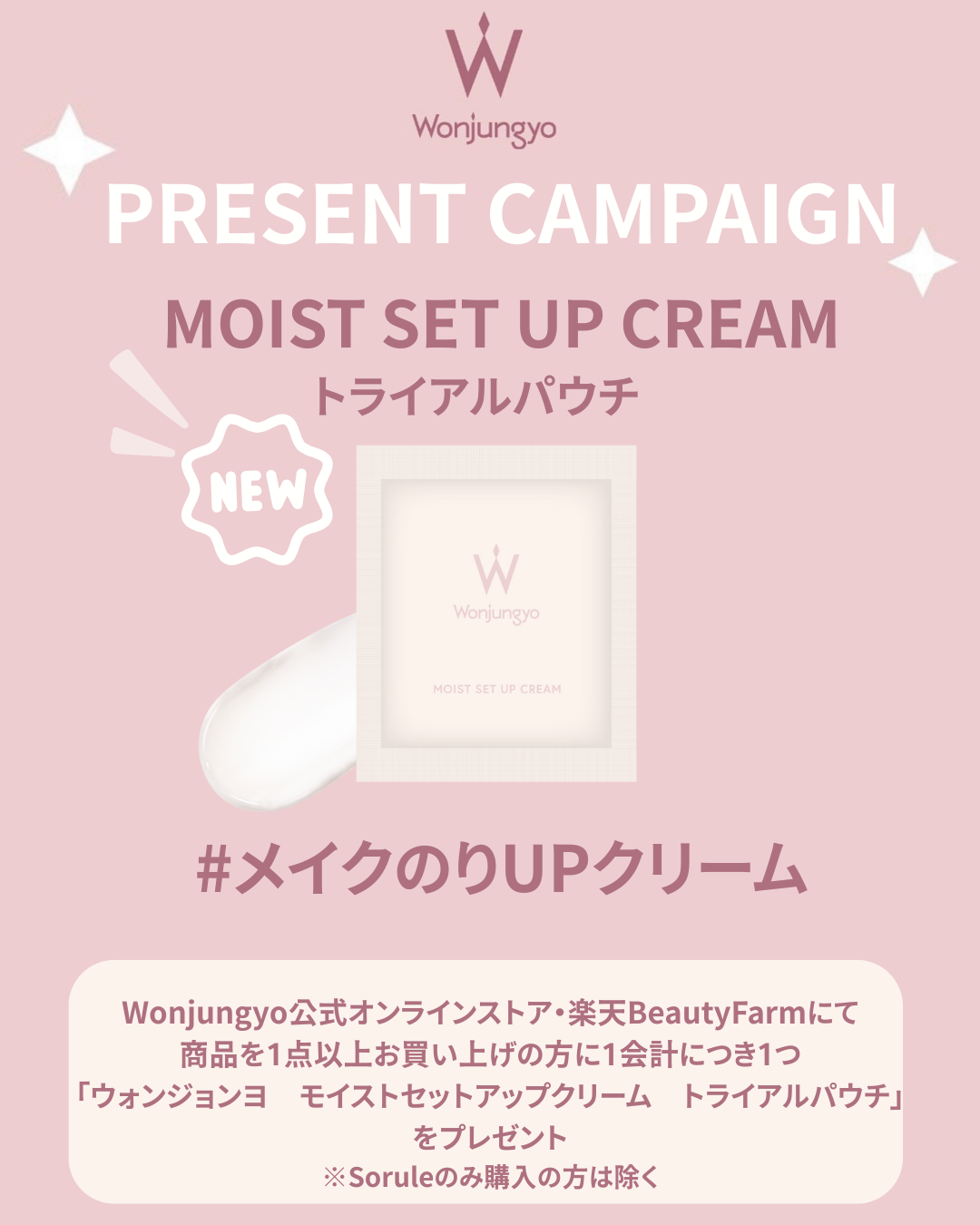この度、Wonjungyo公式オンラインストア・Beautyfarm楽天市場店にて商品を1点以上お買い上げの方に、1会計につき1つ「ウォンジョンヨ モイストセットアップクリーム トライアルパウチ」をプレゼントするキャンペーンを開催いたします。