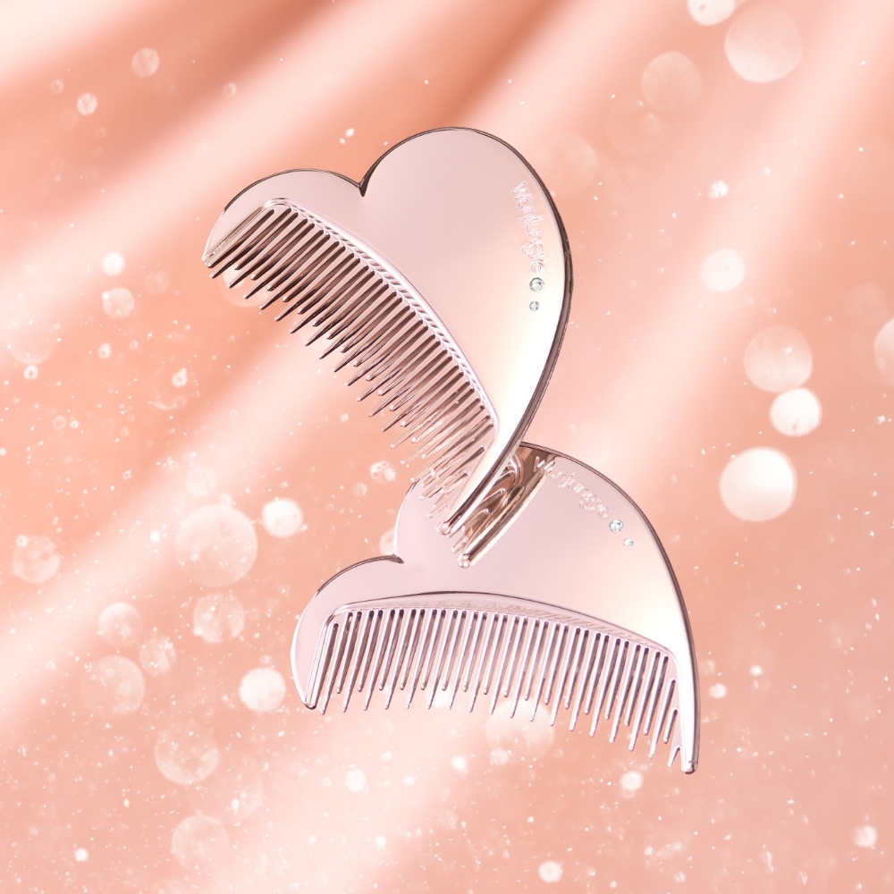 そして今回特にこだわったのが、毎日心地よく使える使用感。コームを頭部に当てた時のフィット感や、ブラッシングする際の持ちやすさなど、細部まで何度も試行錯誤を重ねてようやく完成したハート型フォルムです。手に取るたびに心がときめく、メタリック仕様のシャンパンゴールドカラーのボディにラインストーンをあしらった、高級感のあるデザインに仕上がりました。お出かけ先でのお直し用コームとして、ぜひゲットしてください!