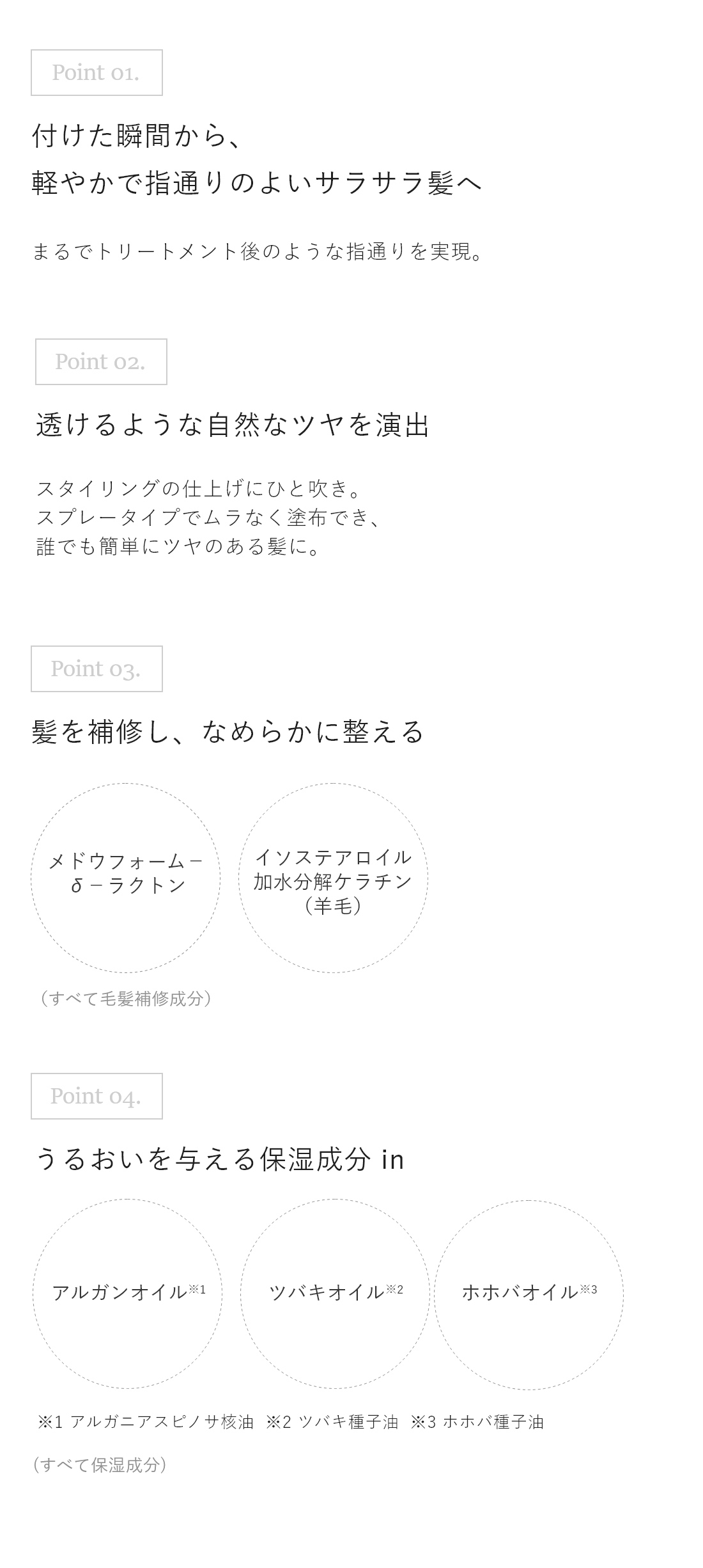 ご使用前によく振ってから、髪から15~20cm程度はなして適量をスプレーし、手ぐしを通して仕上げてください。