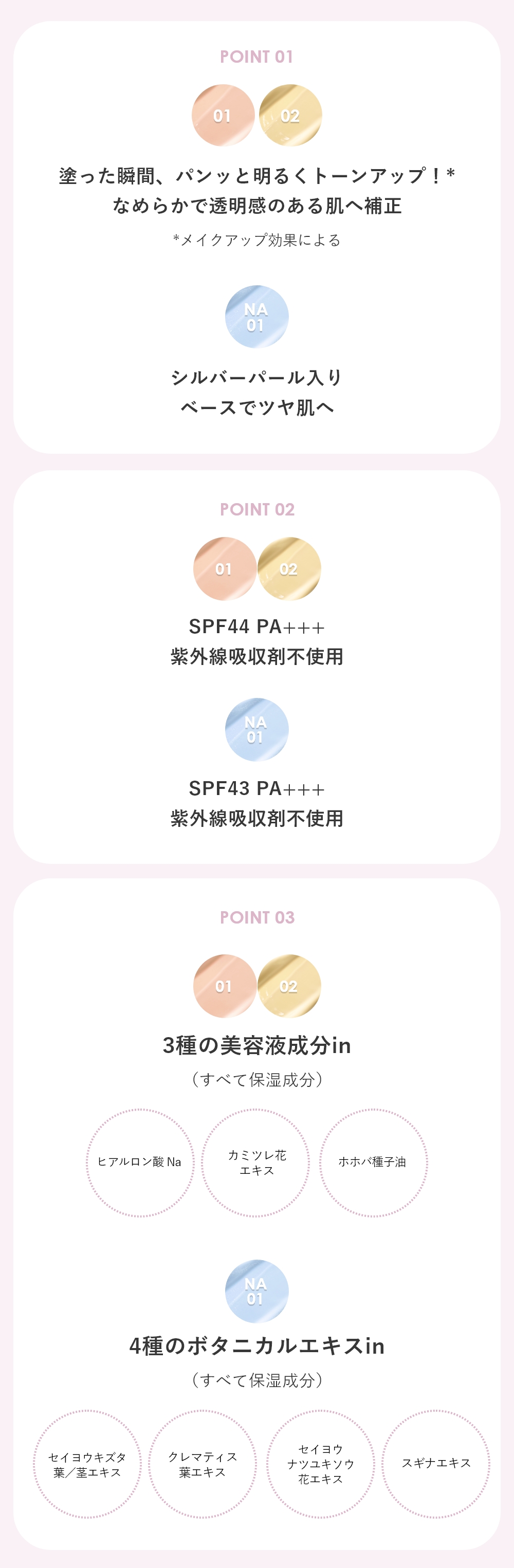 水、シクロペンタシロキサン、グリセリン、酸化チタン、エチルヘキサン酸セチル、酸化亜鉛、BG、ジフェニルシロキシフェニルトリメチコン、メタクリル酸メチルクロスポリマー、PEG−10ジメチコン、セスキイソステアリン酸ソルビタン、硫酸Mg、セチルPEG/PPG−10/1ジメチコン、セスキオレイン酸ソルビタン、ジステアルジモニウムヘクトライト、水酸化Al、アルミナ、(ベヘン酸/エイコサン二酸)グリセリル、 ステアリン酸、エチルヘキシルグリセリン、フェノキシエタノール、合成フルオロフロゴパイト、ジメチコン、炭酸プロピレン、ジミリスチン酸Al、ポリクオタニウム−51、酸化スズ、ヒアルロン酸Na、セイヨウキズタ葉/茎エキス、ヒバマタエキス、クレマティス葉エキス、セイヨウナツユキソウ花エキス、スギナエキス、タルク、ハイドロゲンジメチコン、グンジョウ